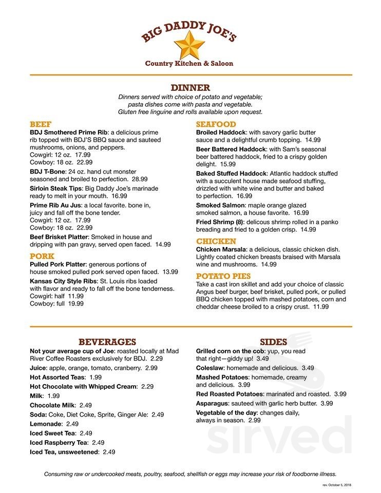Big Daddy Joe S Country Kitchen And Saloon Menu In Plymouth New Hampshire Usa